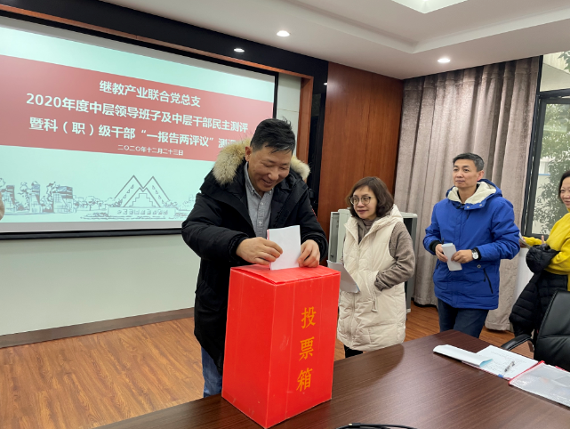 叶枫书记做了2020年度科(职)级干部选拔任用工作报告,对选人用人工作进行了总结和问题分析。继教产业联合党总支副书记、院长谢敏代表sjb世俱杯中国官网入口领导班子作报告,继教产业联合党总支副书记、产业管理办公室主任施明代表产业管理办公室作报告,分别回顾了两个部门领导班子一年来取得的工作成效,分析了存在的问题和不足,提出了下一步工作思路和努力方向。随后,领导班子成员和科(职)级干部一一进行了个人述职。参会人员认真听取了报告,并根据述职情况进行民主测评投票。